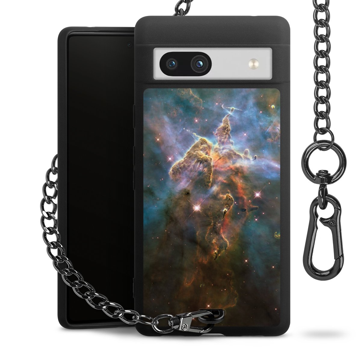 Die mattschwarze Silikon-Handyhülle besteht aus robustem TPU (thermoplastisches Polyurethan). Sie ist flexibel und schützt Dein Smartphone vor Stößen und Kratzern. Die Kette sowie der Karabinerhaken sind aus Metall in Gunmetal-Optik gefertigt. Für dieses Produkt kommen ausschließlich TÜV-geprüfte Materialien zum Einsatz.