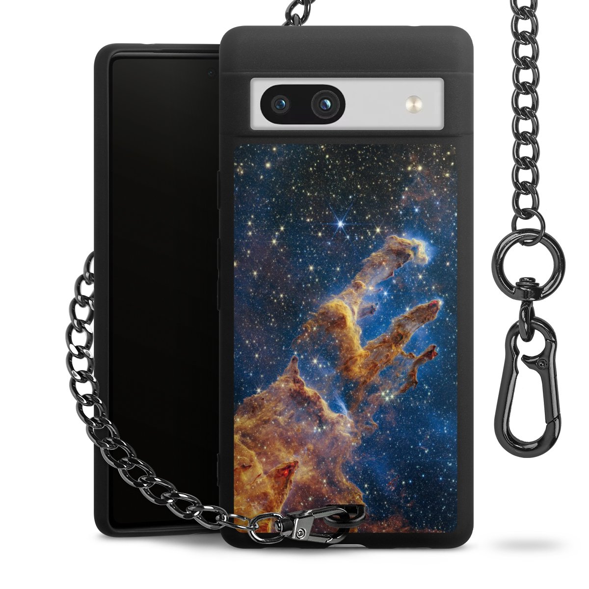 Die mattschwarze Silikon-Handyhülle besteht aus robustem TPU (thermoplastisches Polyurethan). Sie ist flexibel und schützt Dein Smartphone vor Stößen und Kratzern. Die Kette sowie der Karabinerhaken sind aus Metall in Gunmetal-Optik gefertigt. Für dieses Produkt kommen ausschließlich TÜV-geprüfte Materialien zum Einsatz.