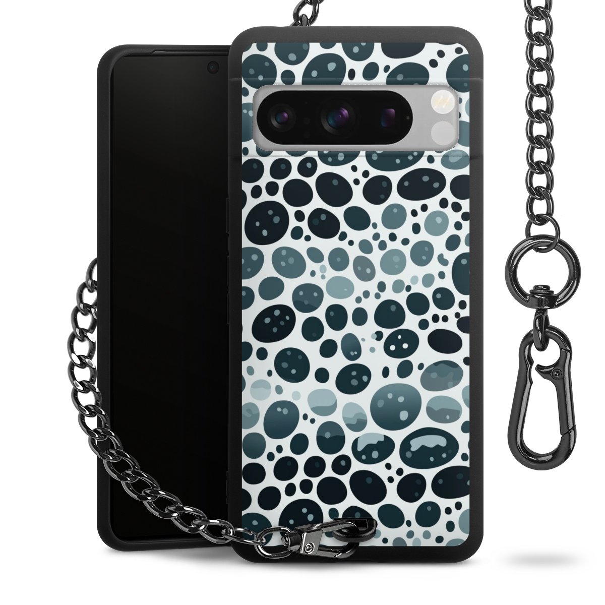 Die mattschwarze Silikon-Handyhülle besteht aus robustem TPU (thermoplastisches Polyurethan). Sie ist flexibel und schützt Dein Smartphone vor Stößen und Kratzern. Die Kette sowie der Karabinerhaken sind aus Metall in Gunmetal-Optik gefertigt. Für dieses Produkt kommen ausschließlich TÜV-geprüfte Materialien zum Einsatz.