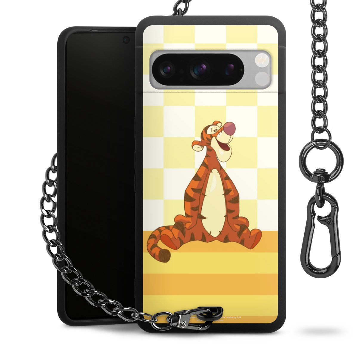 Die mattschwarze Silikon-Handyhülle besteht aus robustem TPU (thermoplastisches Polyurethan). Sie ist flexibel und schützt Dein Smartphone vor Stößen und Kratzern. Die Kette sowie der Karabinerhaken sind aus Metall in Gunmetal-Optik gefertigt. Für dieses Produkt kommen ausschließlich TÜV-geprüfte Materialien zum Einsatz.