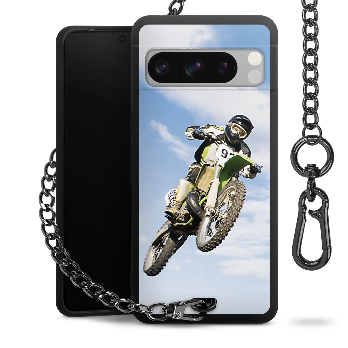 Die mattschwarze Silikon-Handyhülle besteht aus robustem TPU (thermoplastisches Polyurethan). Sie ist flexibel und schützt Dein Smartphone vor Stößen und Kratzern. Die Kette sowie der Karabinerhaken sind aus Metall in Gunmetal-Optik gefertigt. Für dieses Produkt kommen ausschließlich TÜV-geprüfte Materialien zum Einsatz.