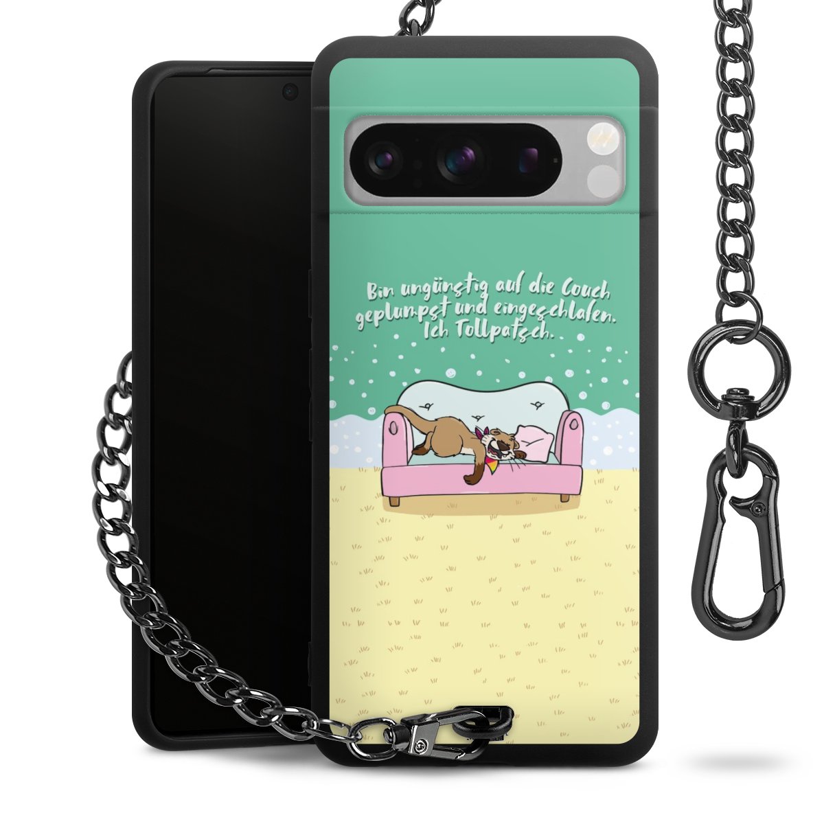 Die mattschwarze Silikon-Handyhülle besteht aus robustem TPU (thermoplastisches Polyurethan). Sie ist flexibel und schützt Dein Smartphone vor Stößen und Kratzern. Die Kette sowie der Karabinerhaken sind aus Metall in Gunmetal-Optik gefertigt. Für dieses Produkt kommen ausschließlich TÜV-geprüfte Materialien zum Einsatz.