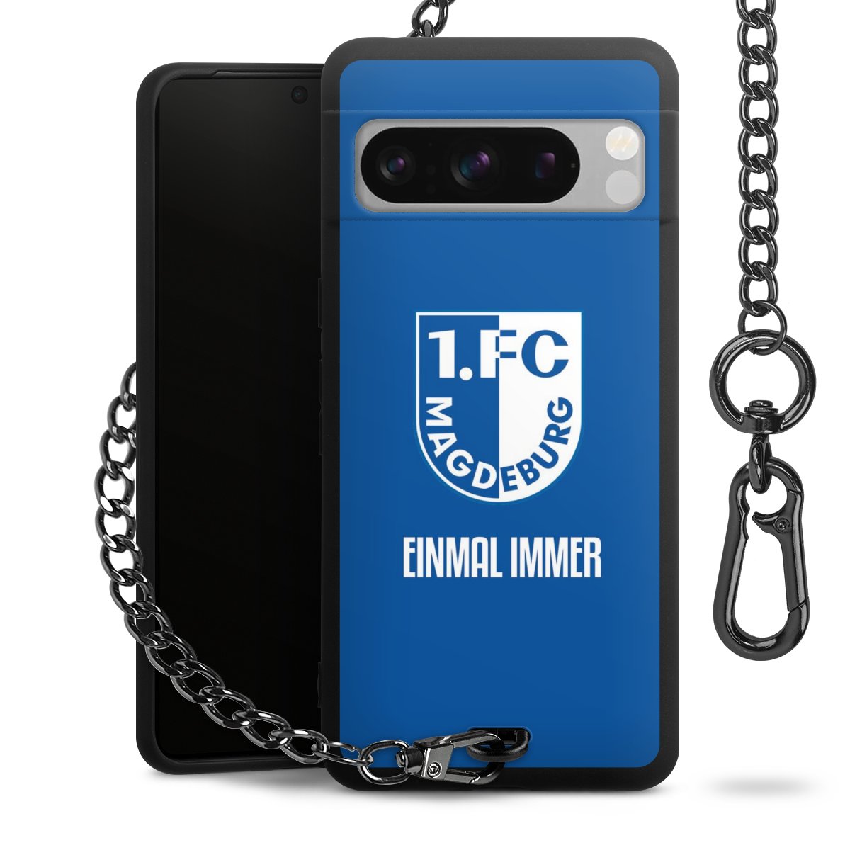 Die Handyhülle verfügt über eine mittig am unteren Rand platzierte Öse, an der die Metallkette stabil befestigt ist. Bestelle die Hülle einfach für Dein Smartphone-Modell, dann passt sie wie angegossen und Du brauchst sie bloß einmal anzudrücken. Handy in die Tasche, Karabiner an den Hosenbund – schon kann die Party starten.