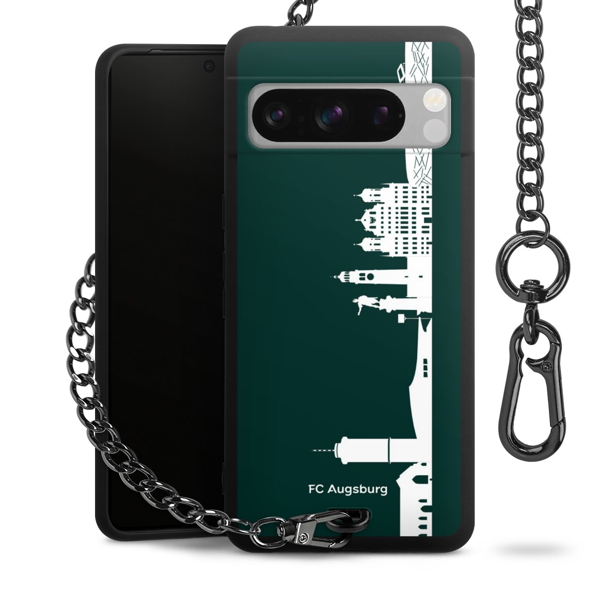 Die mattschwarze Silikon-Handyhülle besteht aus robustem TPU (thermoplastisches Polyurethan). Sie ist flexibel und schützt Dein Smartphone vor Stößen und Kratzern. Die Kette sowie der Karabinerhaken sind aus Metall in Gunmetal-Optik gefertigt. Für dieses Produkt kommen ausschließlich TÜV-geprüfte Materialien zum Einsatz.
