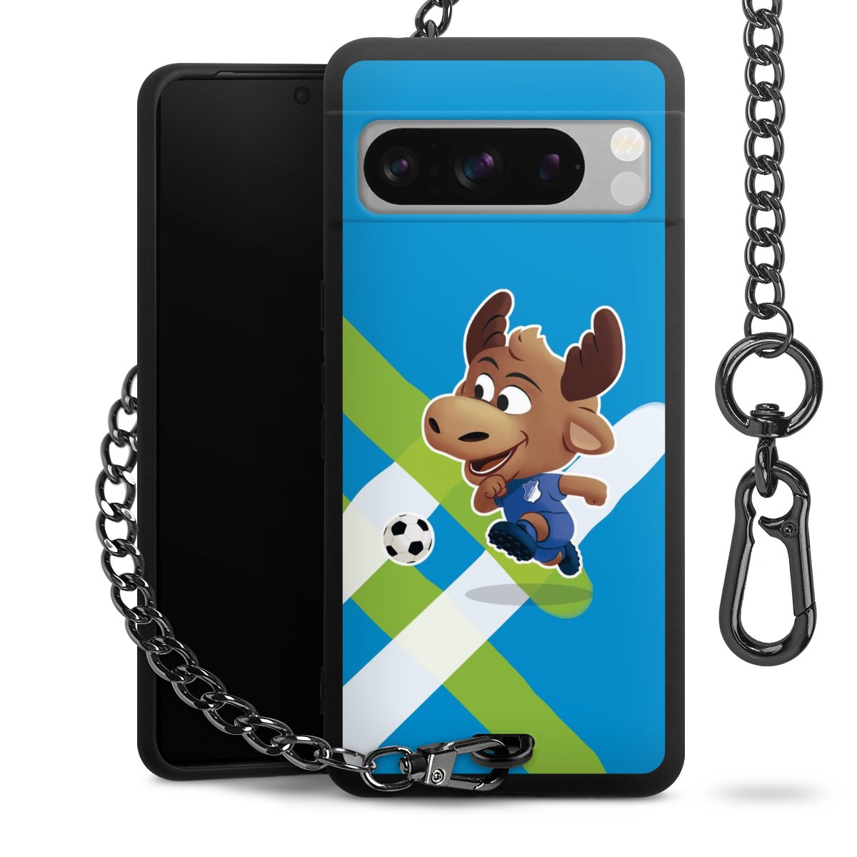Die Handyhülle verfügt über eine mittig am unteren Rand platzierte Öse, an der die Metallkette stabil befestigt ist. Bestelle die Hülle einfach für Dein Smartphone-Modell, dann passt sie wie angegossen und Du brauchst sie bloß einmal anzudrücken. Handy in die Tasche, Karabiner an den Hosenbund – schon kann die Party starten.