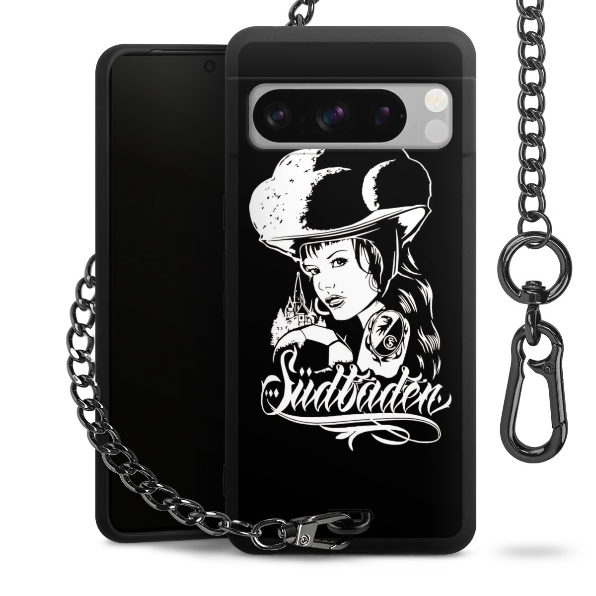 Die mattschwarze Silikon-Handyhülle besteht aus robustem TPU (thermoplastisches Polyurethan). Sie ist flexibel und schützt Dein Smartphone vor Stößen und Kratzern. Die Kette sowie der Karabinerhaken sind aus Metall in Gunmetal-Optik gefertigt. Für dieses Produkt kommen ausschließlich TÜV-geprüfte Materialien zum Einsatz.