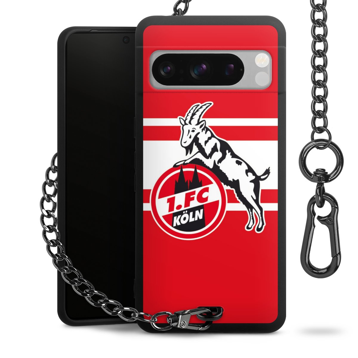 Die Handyhülle verfügt über eine mittig am unteren Rand platzierte Öse, an der die Metallkette stabil befestigt ist. Bestelle die Hülle einfach für Dein Smartphone-Modell, dann passt sie wie angegossen und Du brauchst sie bloß einmal anzudrücken. Handy in die Tasche, Karabiner an den Hosenbund – schon kann die Party starten.