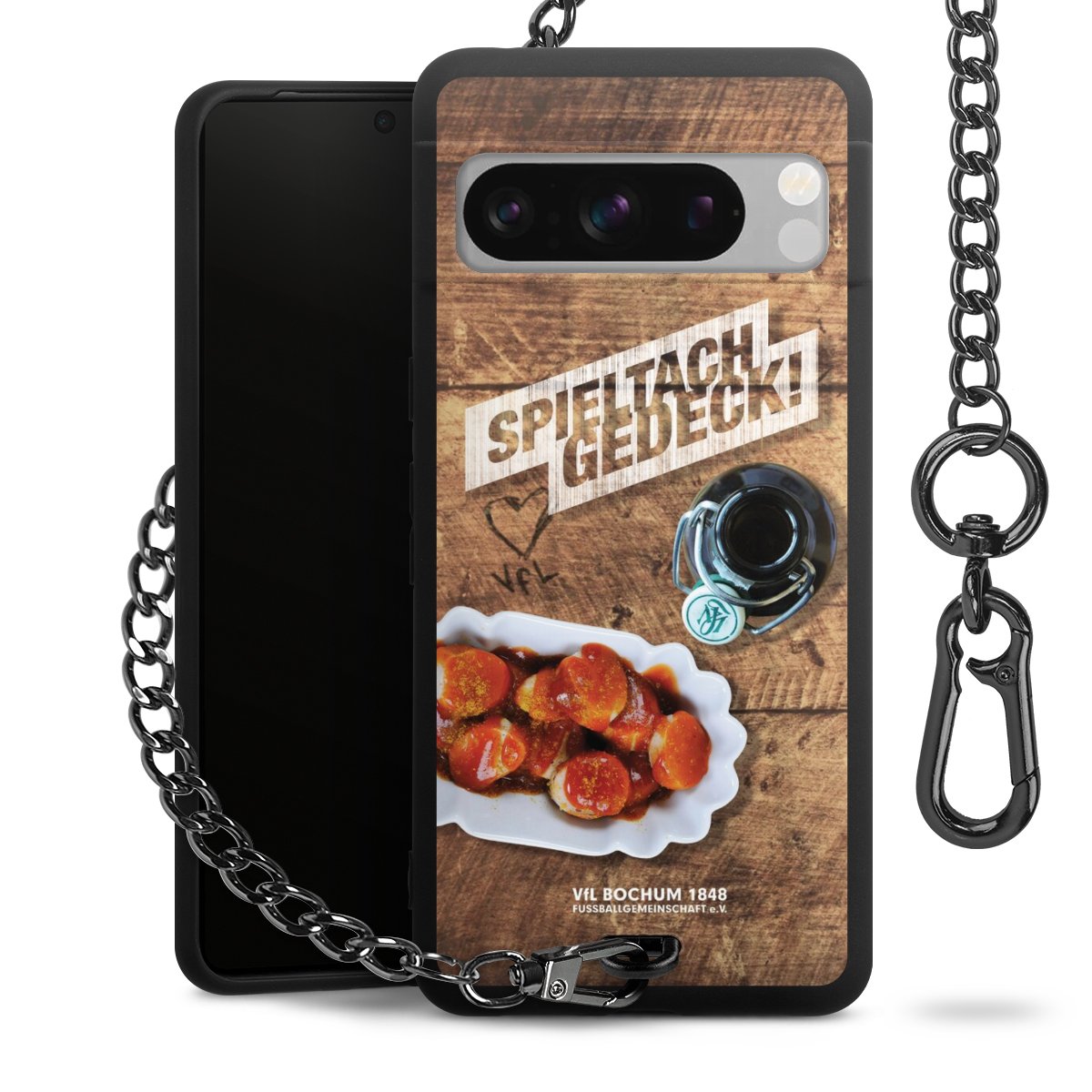 Die mattschwarze Silikon-Handyhülle besteht aus robustem TPU (thermoplastisches Polyurethan). Sie ist flexibel und schützt Dein Smartphone vor Stößen und Kratzern. Die Kette sowie der Karabinerhaken sind aus Metall in Gunmetal-Optik gefertigt. Für dieses Produkt kommen ausschließlich TÜV-geprüfte Materialien zum Einsatz.