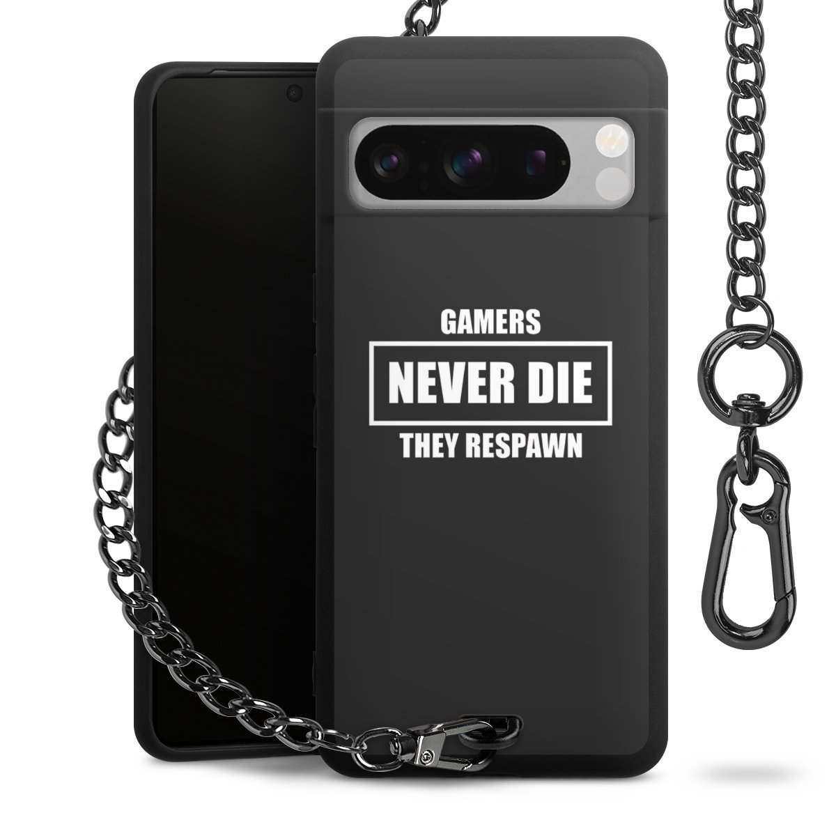 Die mattschwarze Silikon-Handyhülle besteht aus robustem TPU (thermoplastisches Polyurethan). Sie ist flexibel und schützt Dein Smartphone vor Stößen und Kratzern. Die Kette sowie der Karabinerhaken sind aus Metall in Gunmetal-Optik gefertigt. Für dieses Produkt kommen ausschließlich TÜV-geprüfte Materialien zum Einsatz.