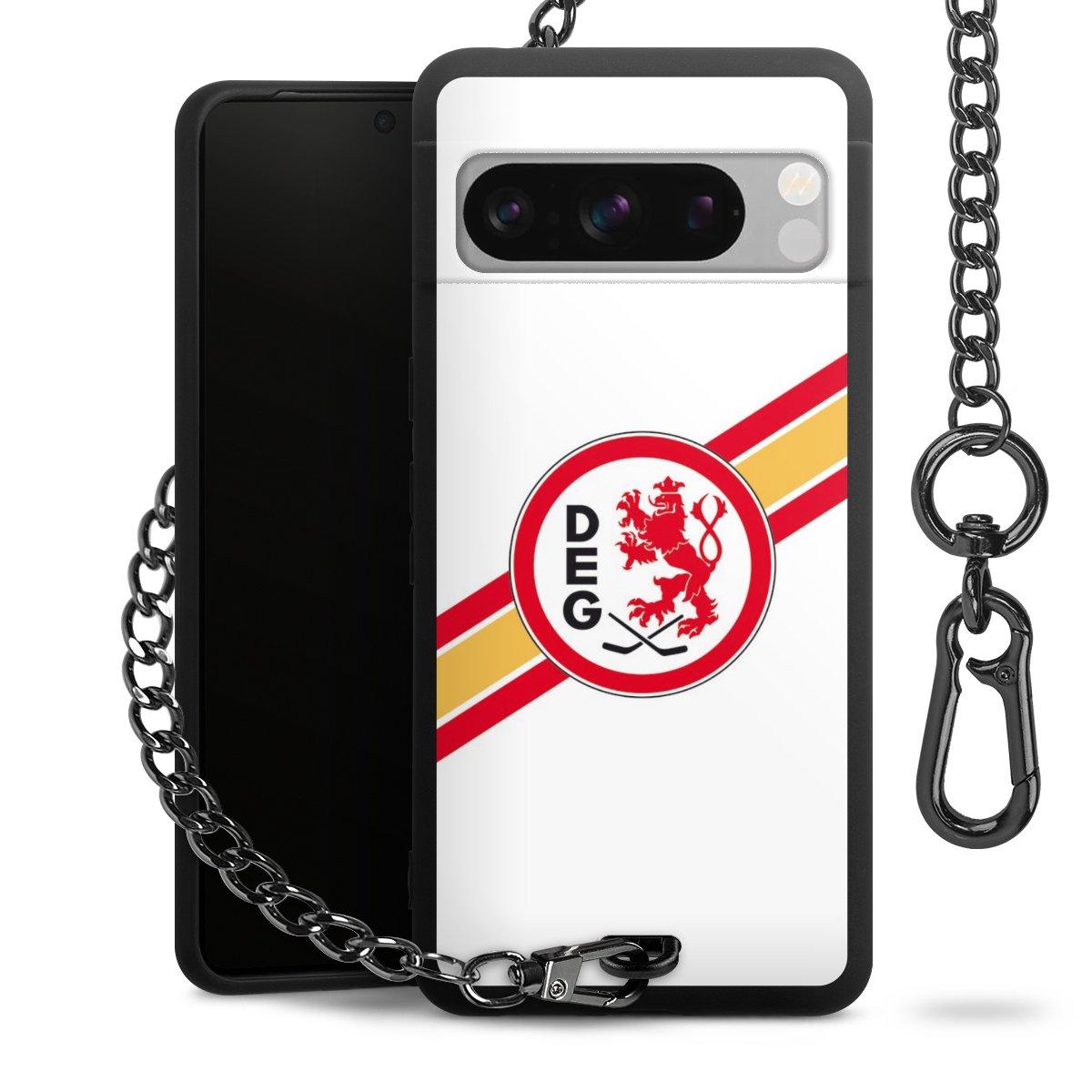 Die mattschwarze Silikon-Handyhülle besteht aus robustem TPU (thermoplastisches Polyurethan). Sie ist flexibel und schützt Dein Smartphone vor Stößen und Kratzern. Die Kette sowie der Karabinerhaken sind aus Metall in Gunmetal-Optik gefertigt. Für dieses Produkt kommen ausschließlich TÜV-geprüfte Materialien zum Einsatz.