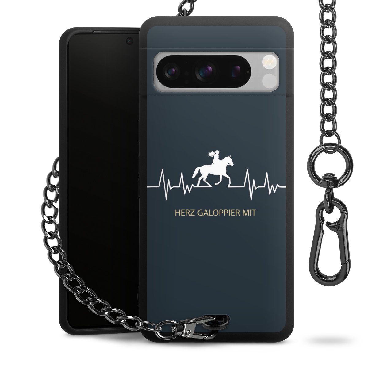 Die mattschwarze Silikon-Handyhülle besteht aus robustem TPU (thermoplastisches Polyurethan). Sie ist flexibel und schützt Dein Smartphone vor Stößen und Kratzern. Die Kette sowie der Karabinerhaken sind aus Metall in Gunmetal-Optik gefertigt. Für dieses Produkt kommen ausschließlich TÜV-geprüfte Materialien zum Einsatz.