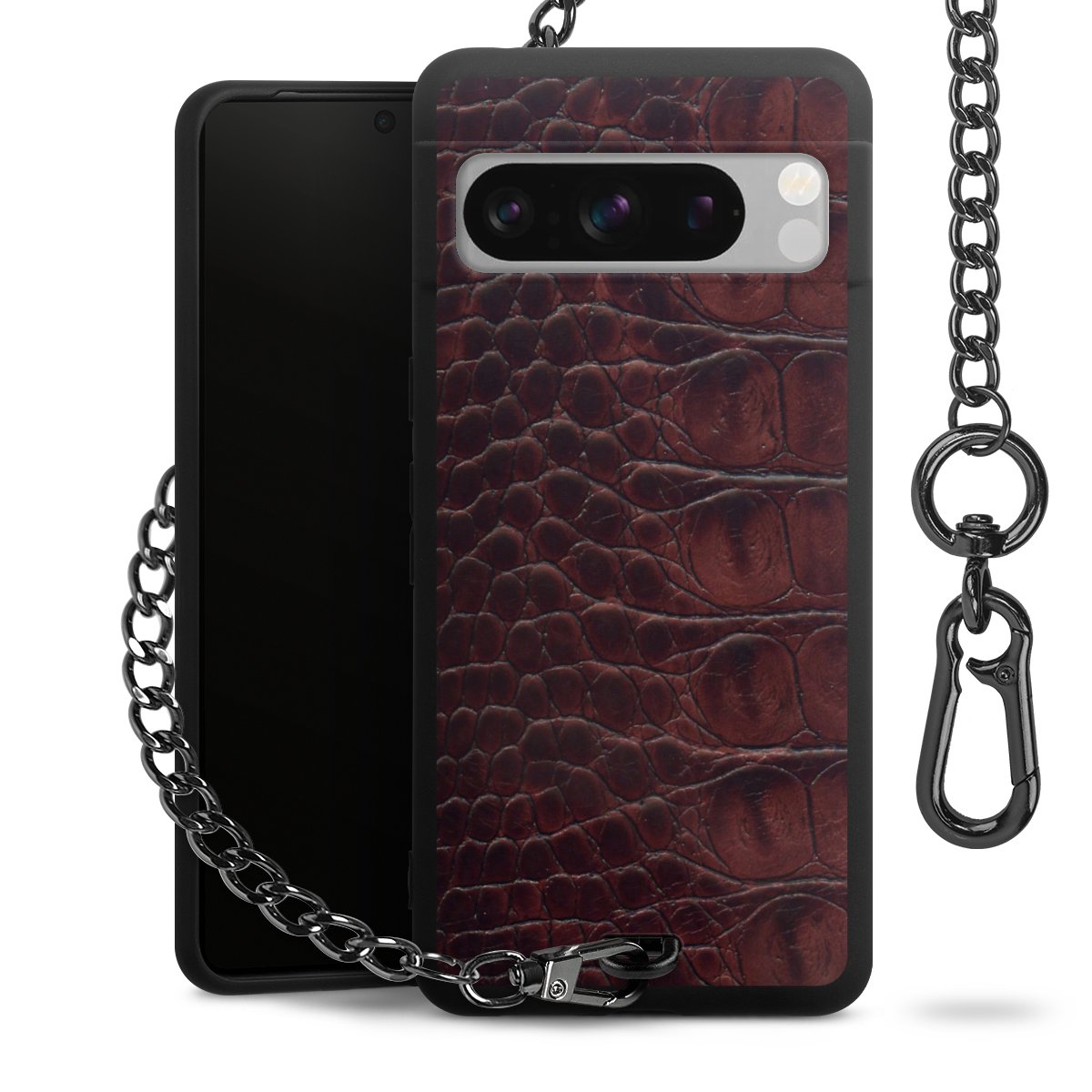 Die mattschwarze Silikon-Handyhülle besteht aus robustem TPU (thermoplastisches Polyurethan). Sie ist flexibel und schützt Dein Smartphone vor Stößen und Kratzern. Die Kette sowie der Karabinerhaken sind aus Metall in Gunmetal-Optik gefertigt. Für dieses Produkt kommen ausschließlich TÜV-geprüfte Materialien zum Einsatz.