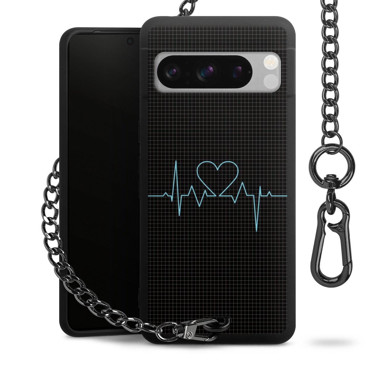 Die mattschwarze Silikon-Handyhülle besteht aus robustem TPU (thermoplastisches Polyurethan). Sie ist flexibel und schützt Dein Smartphone vor Stößen und Kratzern. Die Kette sowie der Karabinerhaken sind aus Metall in Gunmetal-Optik gefertigt. Für dieses Produkt kommen ausschließlich TÜV-geprüfte Materialien zum Einsatz.