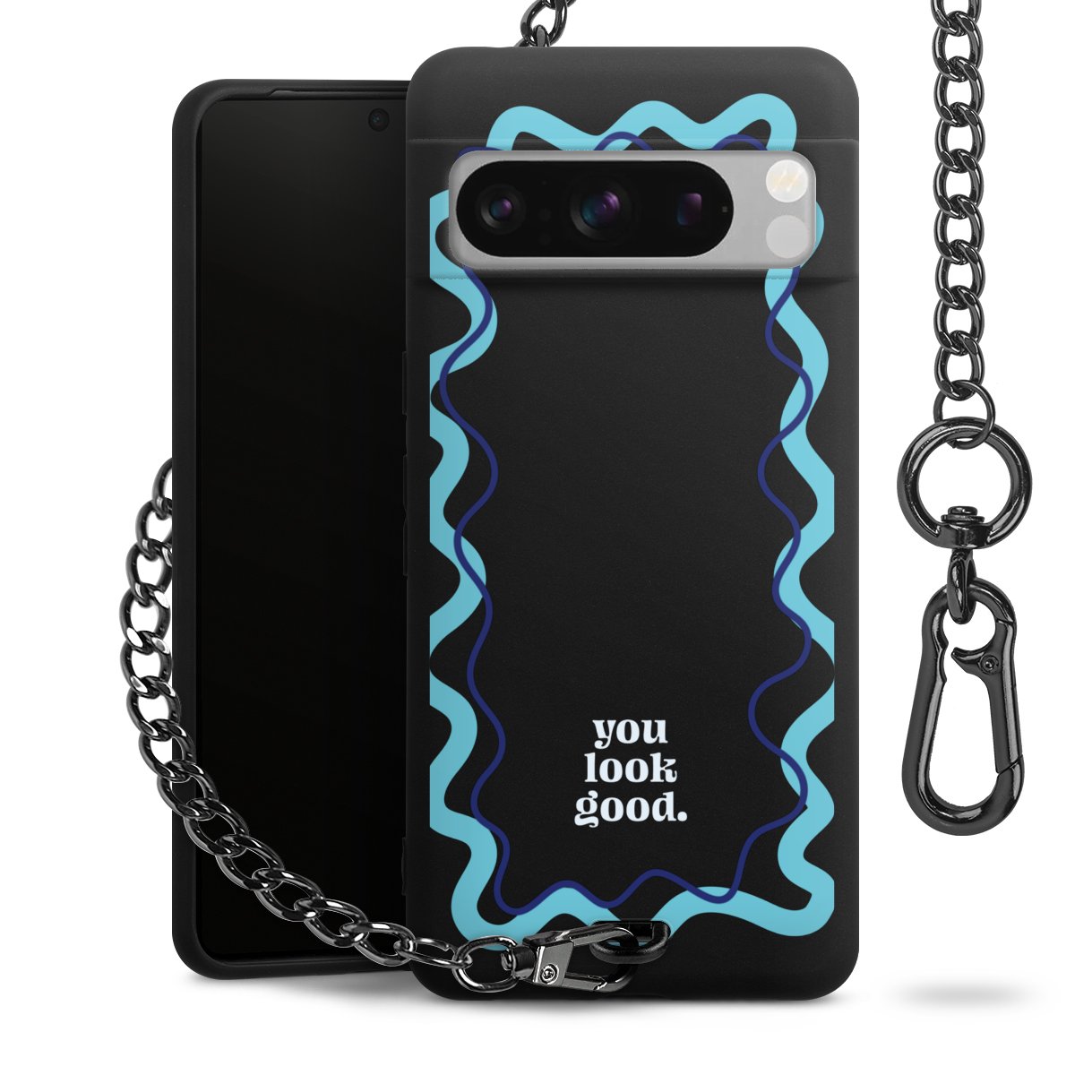 Die mattschwarze Silikon-Handyhülle besteht aus robustem TPU (thermoplastisches Polyurethan). Sie ist flexibel und schützt Dein Smartphone vor Stößen und Kratzern. Die Kette sowie der Karabinerhaken sind aus Metall in Gunmetal-Optik gefertigt. Für dieses Produkt kommen ausschließlich TÜV-geprüfte Materialien zum Einsatz.
