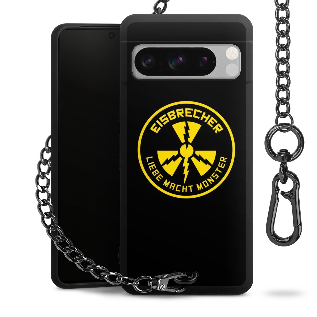 Die mattschwarze Silikon-Handyhülle besteht aus robustem TPU (thermoplastisches Polyurethan). Sie ist flexibel und schützt Dein Smartphone vor Stößen und Kratzern. Die Kette sowie der Karabinerhaken sind aus Metall in Gunmetal-Optik gefertigt. Für dieses Produkt kommen ausschließlich TÜV-geprüfte Materialien zum Einsatz.