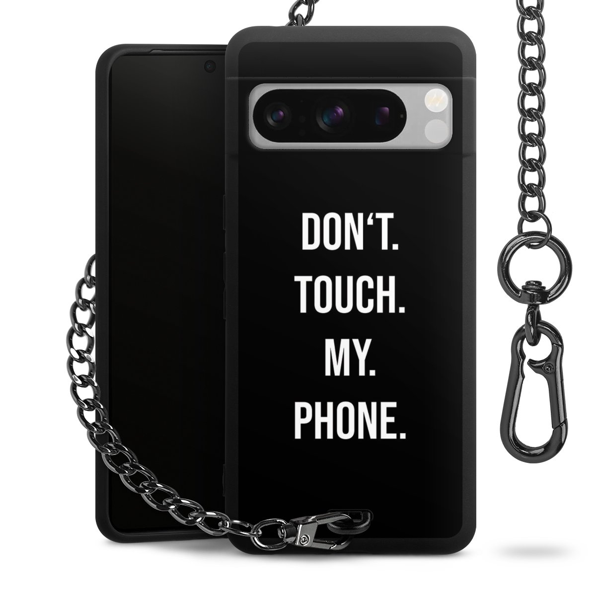 Die mattschwarze Silikon-Handyhülle besteht aus robustem TPU (thermoplastisches Polyurethan). Sie ist flexibel und schützt Dein Smartphone vor Stößen und Kratzern. Die Kette sowie der Karabinerhaken sind aus Metall in Gunmetal-Optik gefertigt. Für dieses Produkt kommen ausschließlich TÜV-geprüfte Materialien zum Einsatz.