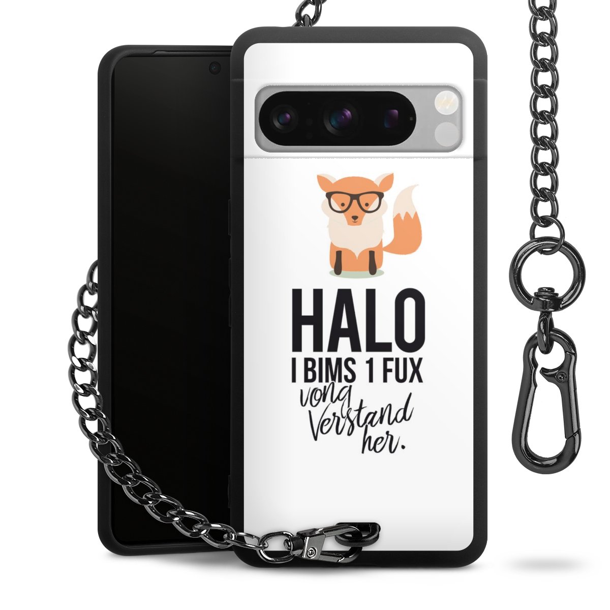 Die mattschwarze Silikon-Handyhülle besteht aus robustem TPU (thermoplastisches Polyurethan). Sie ist flexibel und schützt Dein Smartphone vor Stößen und Kratzern. Die Kette sowie der Karabinerhaken sind aus Metall in Gunmetal-Optik gefertigt. Für dieses Produkt kommen ausschließlich TÜV-geprüfte Materialien zum Einsatz.