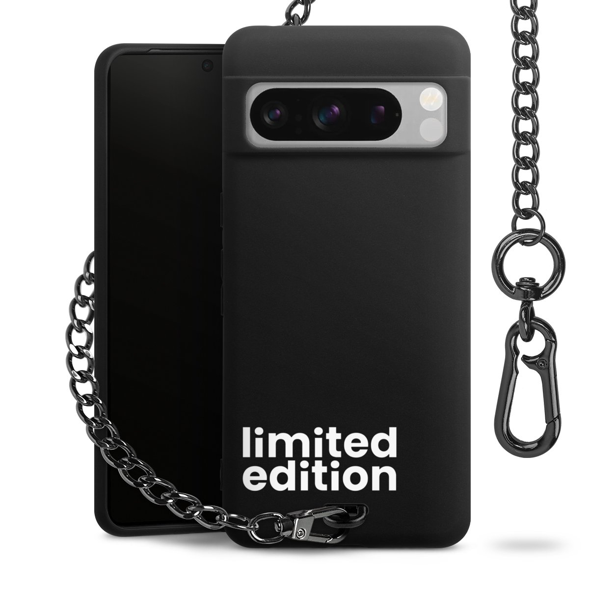 Die mattschwarze Silikon-Handyhülle besteht aus robustem TPU (thermoplastisches Polyurethan). Sie ist flexibel und schützt Dein Smartphone vor Stößen und Kratzern. Die Kette sowie der Karabinerhaken sind aus Metall in Gunmetal-Optik gefertigt. Für dieses Produkt kommen ausschließlich TÜV-geprüfte Materialien zum Einsatz.