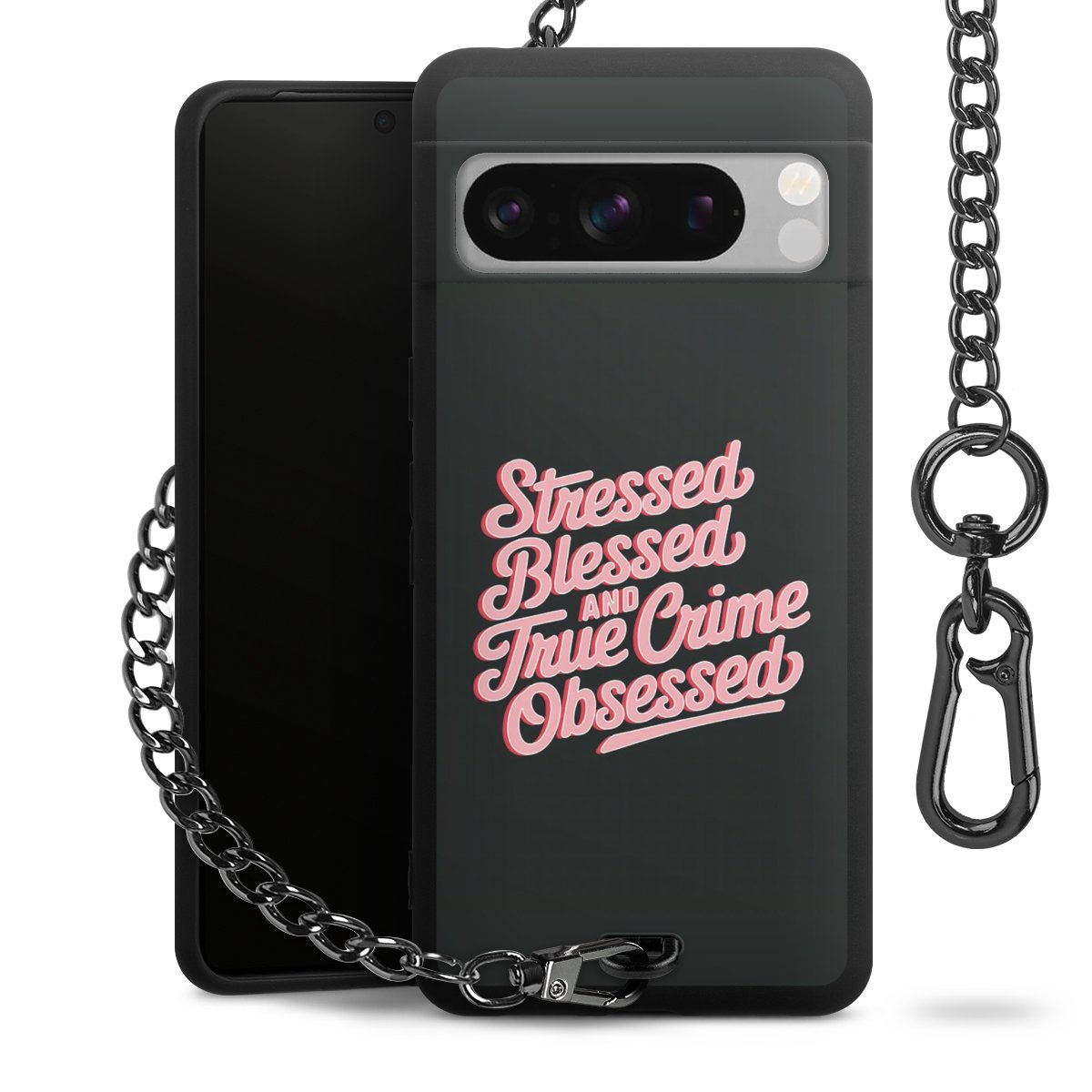 Die mattschwarze Silikon-Handyhülle besteht aus robustem TPU (thermoplastisches Polyurethan). Sie ist flexibel und schützt Dein Smartphone vor Stößen und Kratzern. Die Kette sowie der Karabinerhaken sind aus Metall in Gunmetal-Optik gefertigt. Für dieses Produkt kommen ausschließlich TÜV-geprüfte Materialien zum Einsatz.