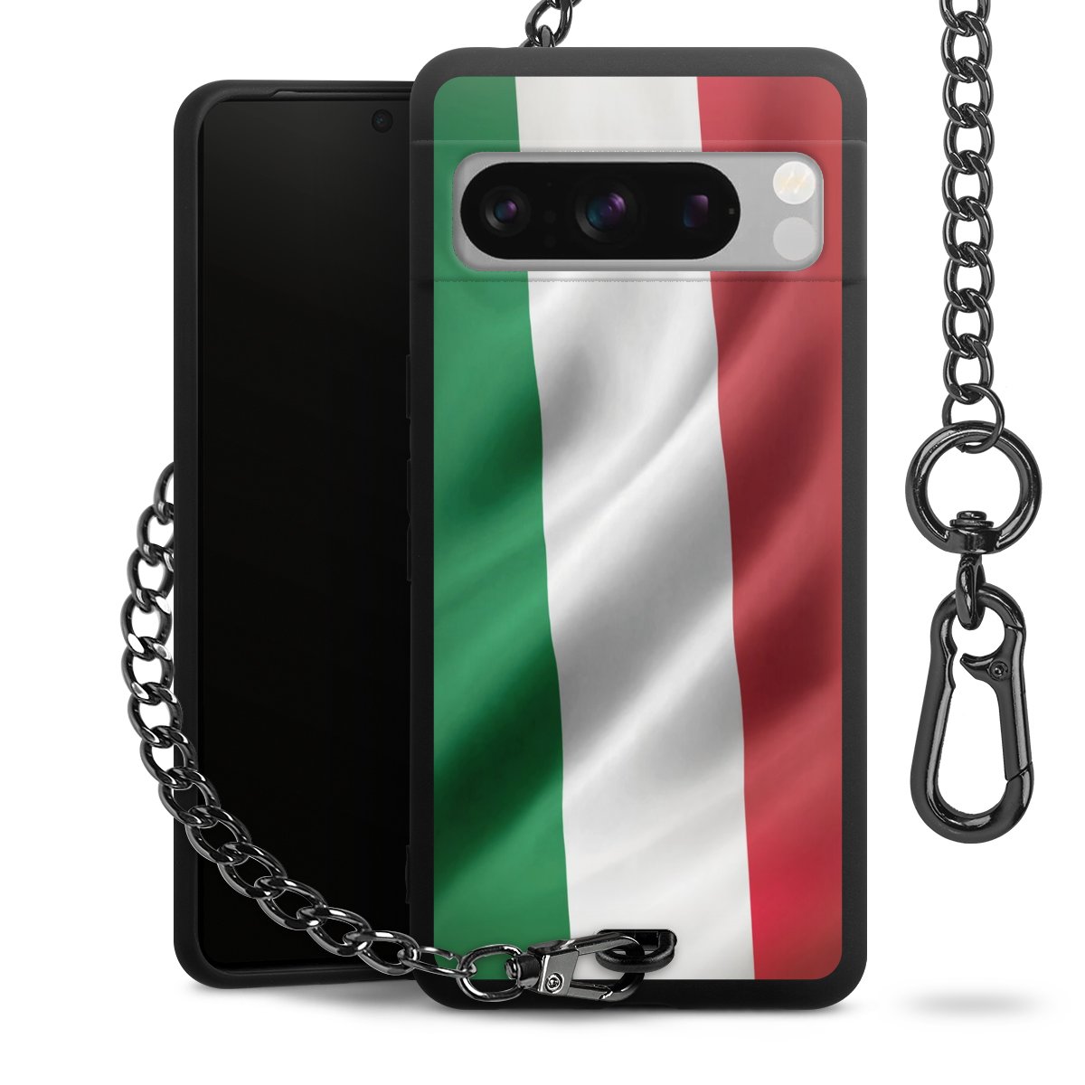 Die mattschwarze Silikon-Handyhülle besteht aus robustem TPU (thermoplastisches Polyurethan). Sie ist flexibel und schützt Dein Smartphone vor Stößen und Kratzern. Die Kette sowie der Karabinerhaken sind aus Metall in Gunmetal-Optik gefertigt. Für dieses Produkt kommen ausschließlich TÜV-geprüfte Materialien zum Einsatz.
