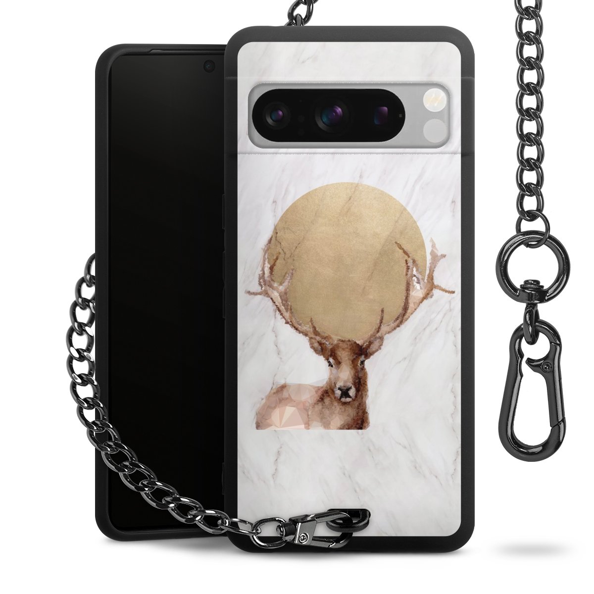 Die mattschwarze Silikon-Handyhülle besteht aus robustem TPU (thermoplastisches Polyurethan). Sie ist flexibel und schützt Dein Smartphone vor Stößen und Kratzern. Die Kette sowie der Karabinerhaken sind aus Metall in Gunmetal-Optik gefertigt. Für dieses Produkt kommen ausschließlich TÜV-geprüfte Materialien zum Einsatz.
