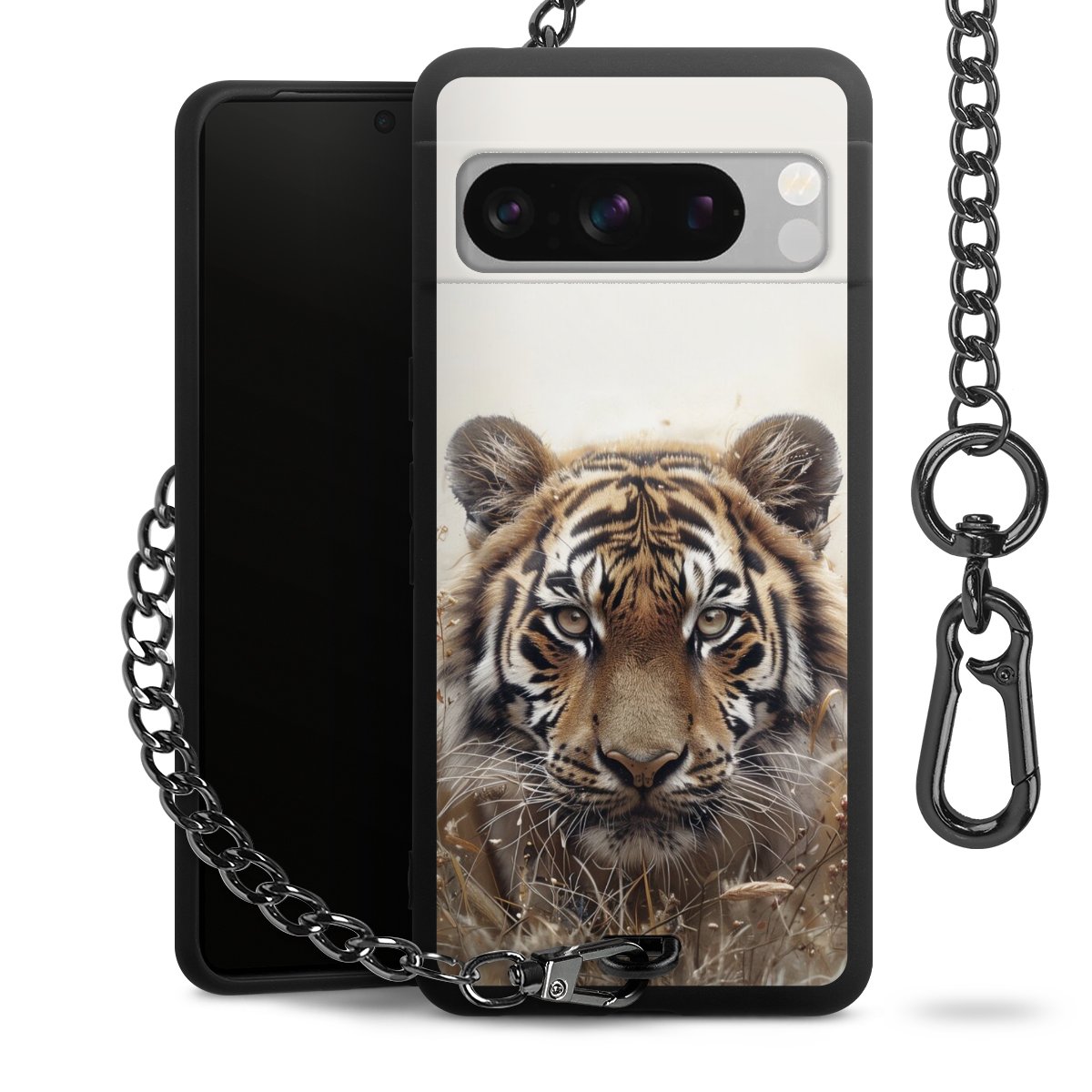 Die mattschwarze Silikon-Handyhülle besteht aus robustem TPU (thermoplastisches Polyurethan). Sie ist flexibel und schützt Dein Smartphone vor Stößen und Kratzern. Die Kette sowie der Karabinerhaken sind aus Metall in Gunmetal-Optik gefertigt. Für dieses Produkt kommen ausschließlich TÜV-geprüfte Materialien zum Einsatz.