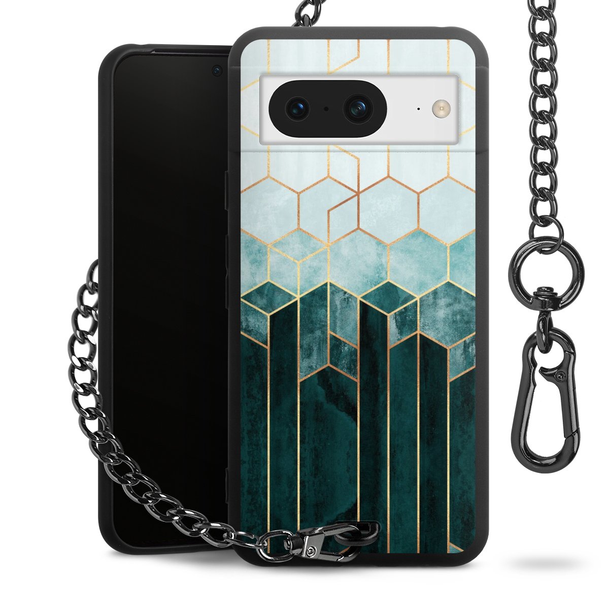 Die mattschwarze Silikon-Handyhülle besteht aus robustem TPU (thermoplastisches Polyurethan). Sie ist flexibel und schützt Dein Smartphone vor Stößen und Kratzern. Die Kette sowie der Karabinerhaken sind aus Metall in Gunmetal-Optik gefertigt. Für dieses Produkt kommen ausschließlich TÜV-geprüfte Materialien zum Einsatz.