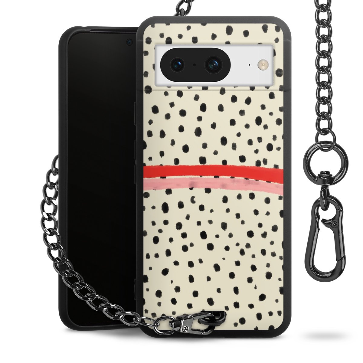 Die mattschwarze Silikon-Handyhülle besteht aus robustem TPU (thermoplastisches Polyurethan). Sie ist flexibel und schützt Dein Smartphone vor Stößen und Kratzern. Die Kette sowie der Karabinerhaken sind aus Metall in Gunmetal-Optik gefertigt. Für dieses Produkt kommen ausschließlich TÜV-geprüfte Materialien zum Einsatz.