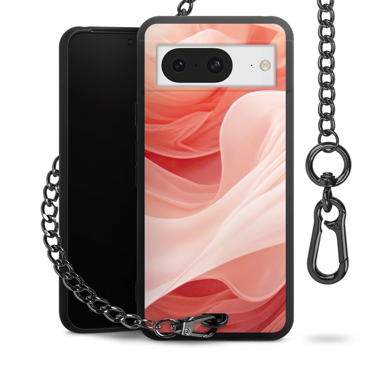 Die mattschwarze Silikon-Handyhülle besteht aus robustem TPU (thermoplastisches Polyurethan). Sie ist flexibel und schützt Dein Smartphone vor Stößen und Kratzern. Die Kette sowie der Karabinerhaken sind aus Metall in Gunmetal-Optik gefertigt. Für dieses Produkt kommen ausschließlich TÜV-geprüfte Materialien zum Einsatz.