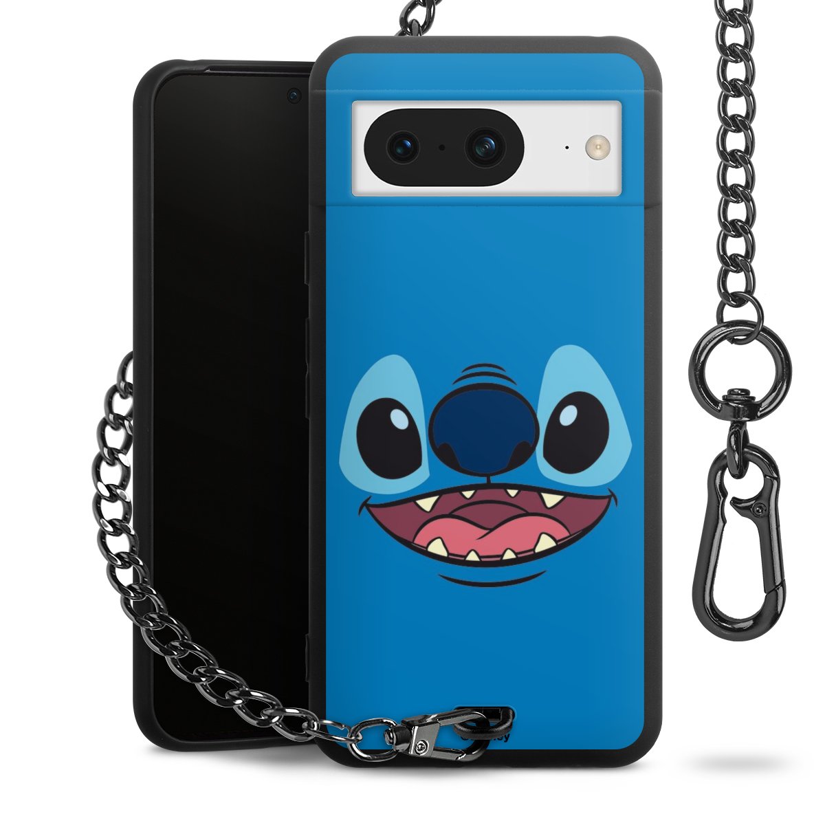 Die Handyhülle verfügt über eine mittig am unteren Rand platzierte Öse, an der die Metallkette stabil befestigt ist. Bestelle die Hülle einfach für Dein Smartphone-Modell, dann passt sie wie angegossen und Du brauchst sie bloß einmal anzudrücken. Handy in die Tasche, Karabiner an den Hosenbund – schon kann die Party starten.