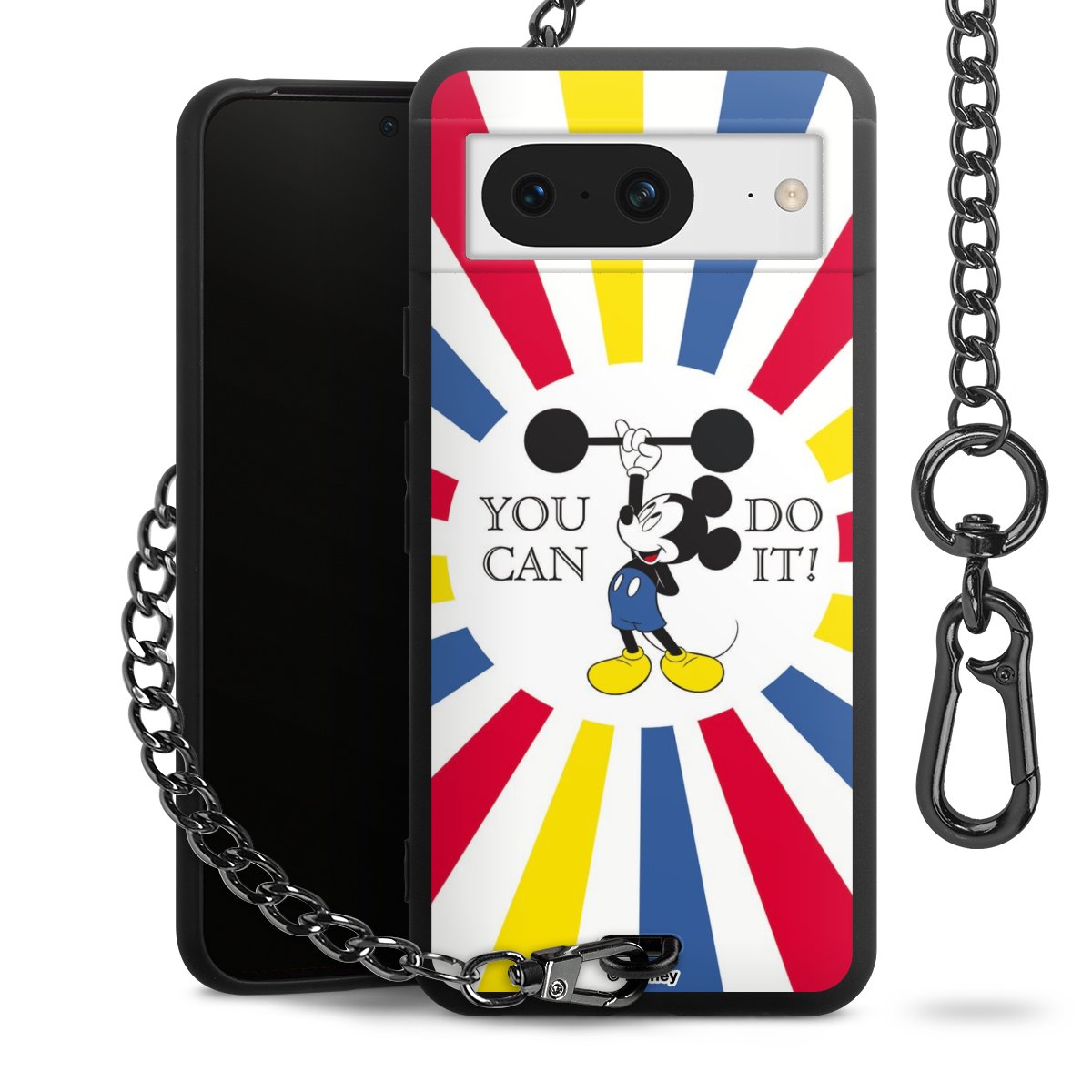 Die Handyhülle verfügt über eine mittig am unteren Rand platzierte Öse, an der die Metallkette stabil befestigt ist. Bestelle die Hülle einfach für Dein Smartphone-Modell, dann passt sie wie angegossen und Du brauchst sie bloß einmal anzudrücken. Handy in die Tasche, Karabiner an den Hosenbund – schon kann die Party starten.