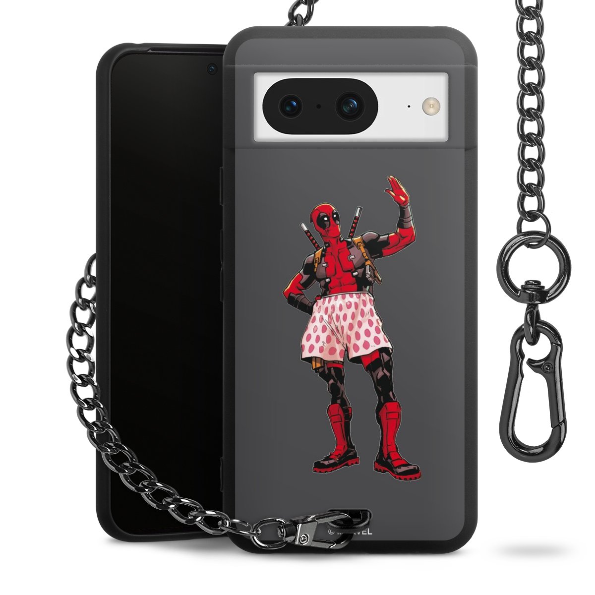 Die mattschwarze Silikon-Handyhülle besteht aus robustem TPU (thermoplastisches Polyurethan). Sie ist flexibel und schützt Dein Smartphone vor Stößen und Kratzern. Die Kette sowie der Karabinerhaken sind aus Metall in Gunmetal-Optik gefertigt. Für dieses Produkt kommen ausschließlich TÜV-geprüfte Materialien zum Einsatz.