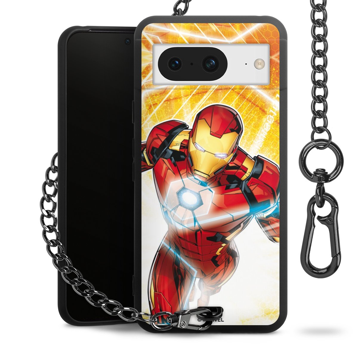 Die mattschwarze Silikon-Handyhülle besteht aus robustem TPU (thermoplastisches Polyurethan). Sie ist flexibel und schützt Dein Smartphone vor Stößen und Kratzern. Die Kette sowie der Karabinerhaken sind aus Metall in Gunmetal-Optik gefertigt. Für dieses Produkt kommen ausschließlich TÜV-geprüfte Materialien zum Einsatz.