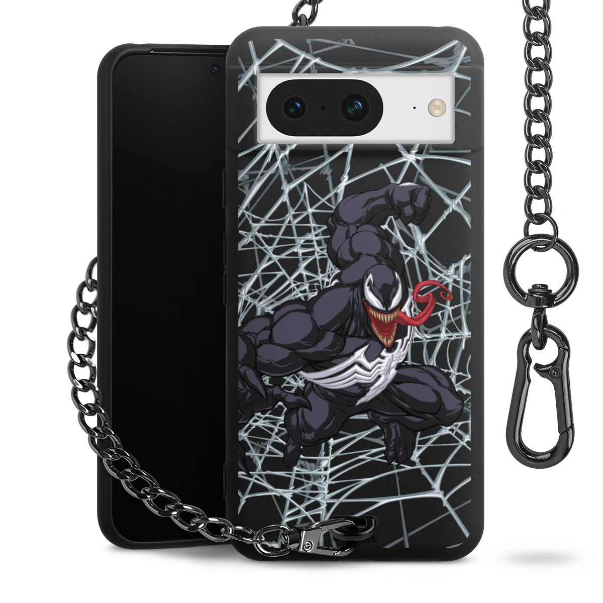 Die mattschwarze Silikon-Handyhülle besteht aus robustem TPU (thermoplastisches Polyurethan). Sie ist flexibel und schützt Dein Smartphone vor Stößen und Kratzern. Die Kette sowie der Karabinerhaken sind aus Metall in Gunmetal-Optik gefertigt. Für dieses Produkt kommen ausschließlich TÜV-geprüfte Materialien zum Einsatz.