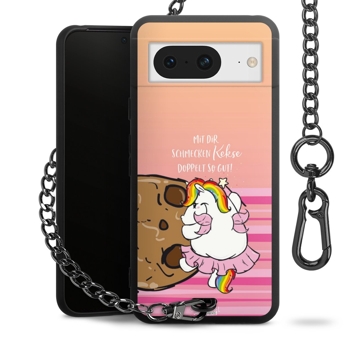 Die mattschwarze Silikon-Handyhülle besteht aus robustem TPU (thermoplastisches Polyurethan). Sie ist flexibel und schützt Dein Smartphone vor Stößen und Kratzern. Die Kette sowie der Karabinerhaken sind aus Metall in Gunmetal-Optik gefertigt. Für dieses Produkt kommen ausschließlich TÜV-geprüfte Materialien zum Einsatz.