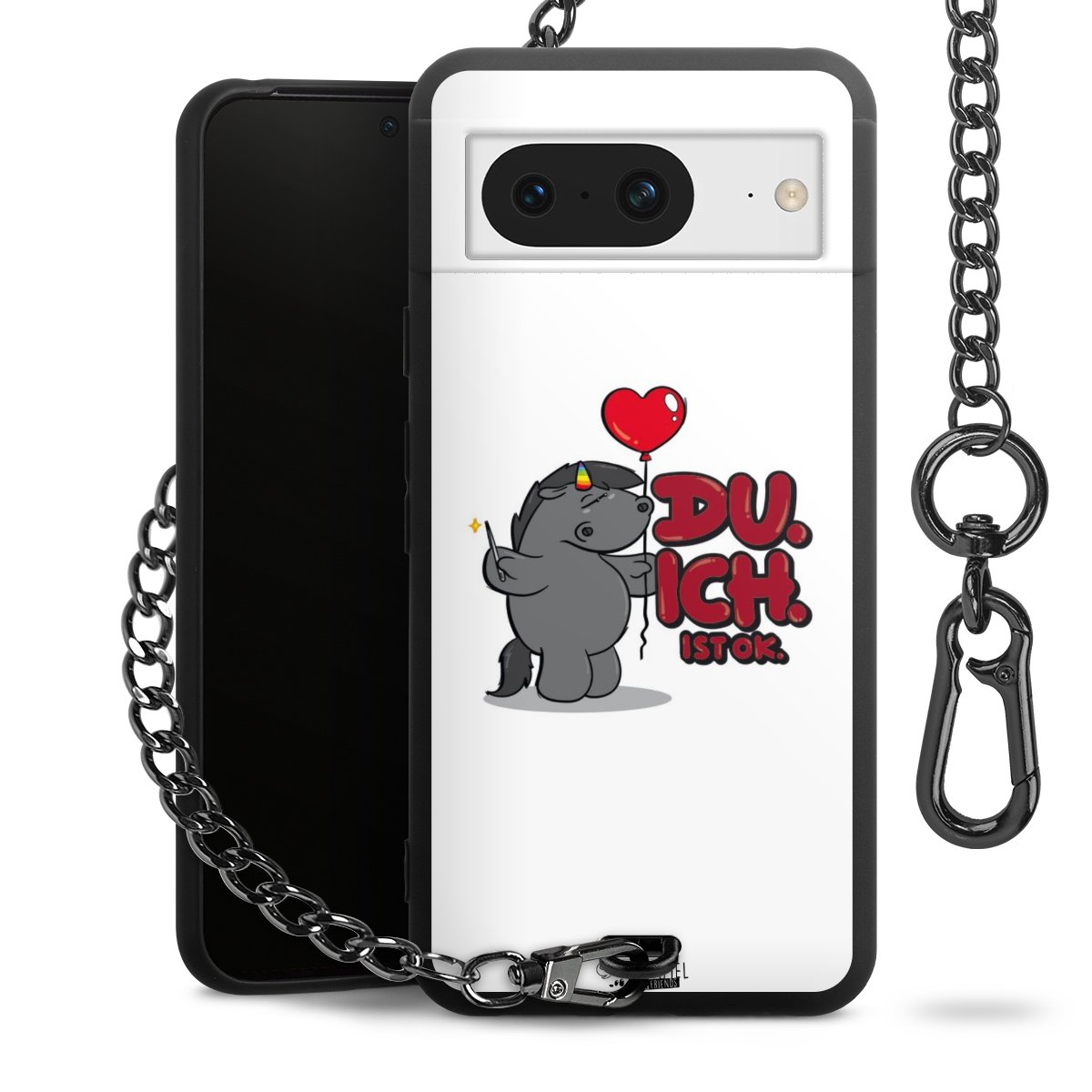 Die mattschwarze Silikon-Handyhülle besteht aus robustem TPU (thermoplastisches Polyurethan). Sie ist flexibel und schützt Dein Smartphone vor Stößen und Kratzern. Die Kette sowie der Karabinerhaken sind aus Metall in Gunmetal-Optik gefertigt. Für dieses Produkt kommen ausschließlich TÜV-geprüfte Materialien zum Einsatz.