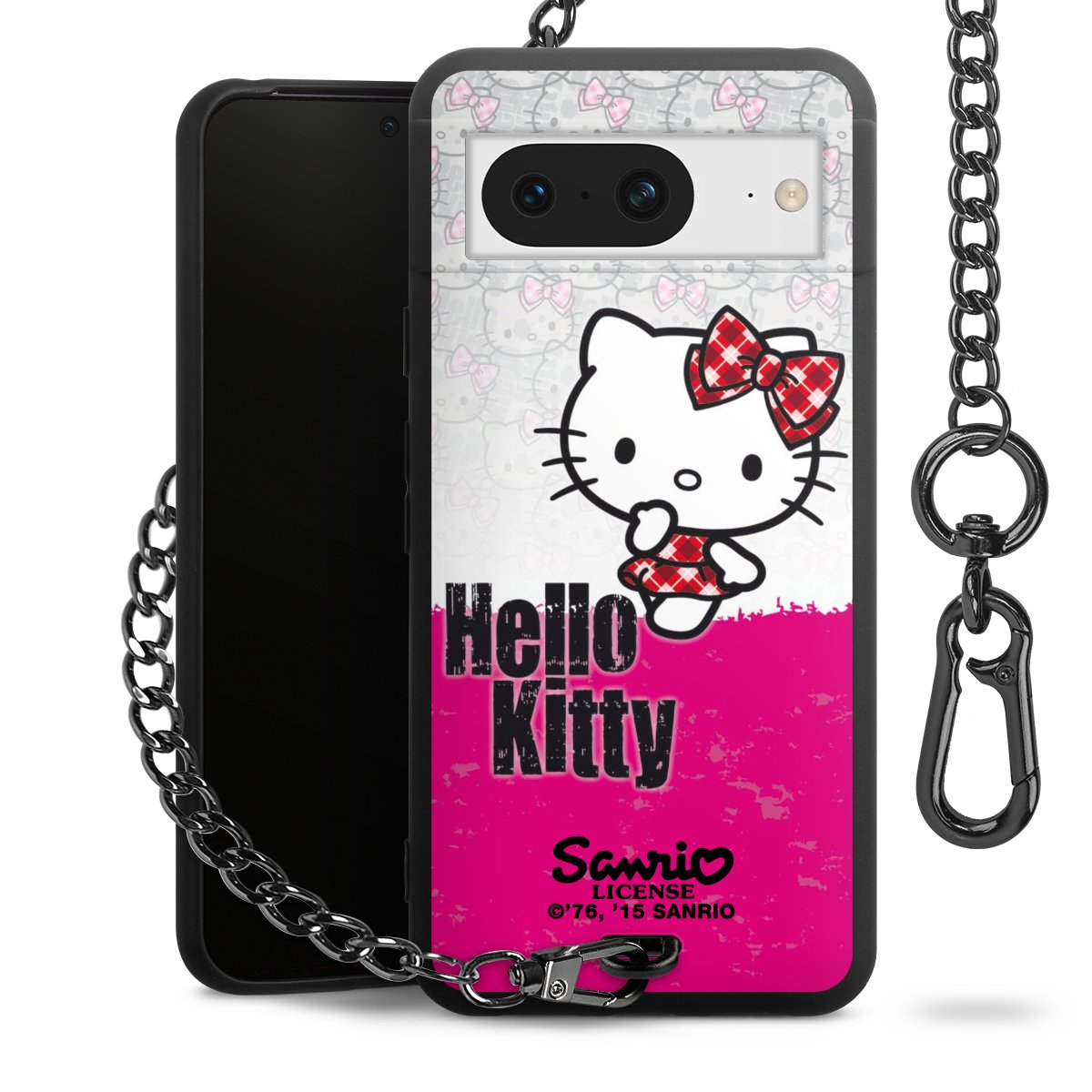 Die Handyhülle verfügt über eine mittig am unteren Rand platzierte Öse, an der die Metallkette stabil befestigt ist. Bestelle die Hülle einfach für Dein Smartphone-Modell, dann passt sie wie angegossen und Du brauchst sie bloß einmal anzudrücken. Handy in die Tasche, Karabiner an den Hosenbund – schon kann die Party starten.