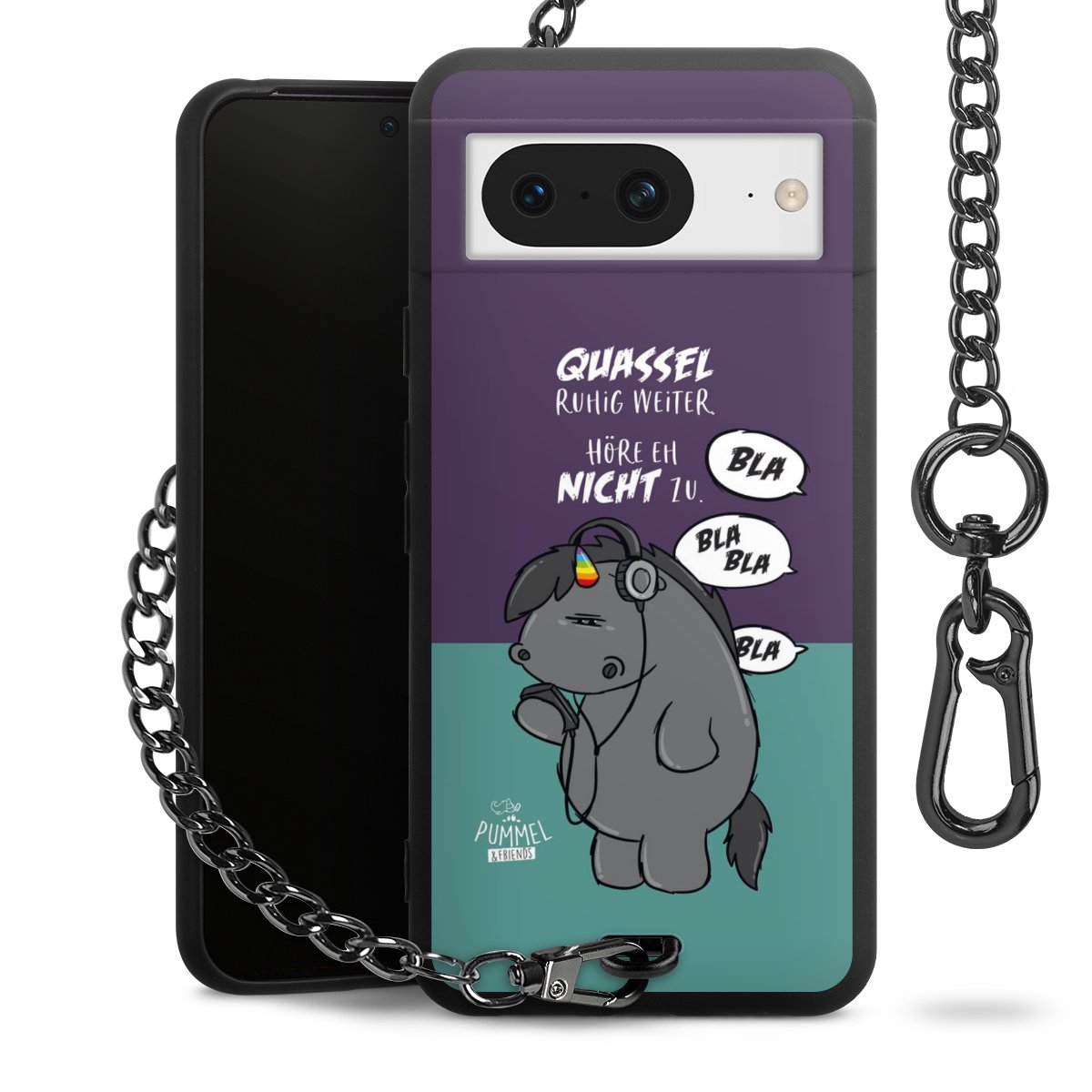 Die mattschwarze Silikon-Handyhülle besteht aus robustem TPU (thermoplastisches Polyurethan). Sie ist flexibel und schützt Dein Smartphone vor Stößen und Kratzern. Die Kette sowie der Karabinerhaken sind aus Metall in Gunmetal-Optik gefertigt. Für dieses Produkt kommen ausschließlich TÜV-geprüfte Materialien zum Einsatz.
