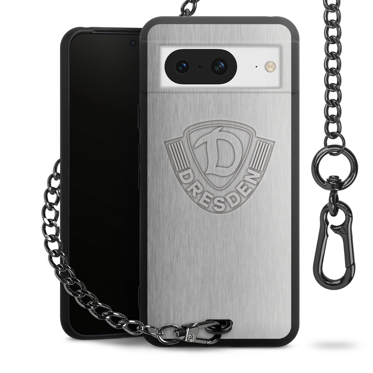 Die mattschwarze Silikon-Handyhülle besteht aus robustem TPU (thermoplastisches Polyurethan). Sie ist flexibel und schützt Dein Smartphone vor Stößen und Kratzern. Die Kette sowie der Karabinerhaken sind aus Metall in Gunmetal-Optik gefertigt. Für dieses Produkt kommen ausschließlich TÜV-geprüfte Materialien zum Einsatz.