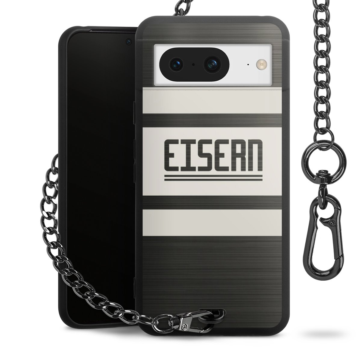 Die mattschwarze Silikon-Handyhülle besteht aus robustem TPU (thermoplastisches Polyurethan). Sie ist flexibel und schützt Dein Smartphone vor Stößen und Kratzern. Die Kette sowie der Karabinerhaken sind aus Metall in Gunmetal-Optik gefertigt. Für dieses Produkt kommen ausschließlich TÜV-geprüfte Materialien zum Einsatz.