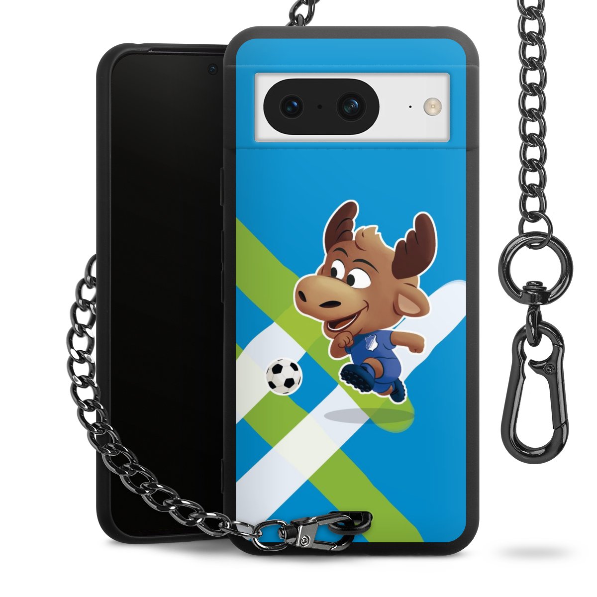 Die Handyhülle verfügt über eine mittig am unteren Rand platzierte Öse, an der die Metallkette stabil befestigt ist. Bestelle die Hülle einfach für Dein Smartphone-Modell, dann passt sie wie angegossen und Du brauchst sie bloß einmal anzudrücken. Handy in die Tasche, Karabiner an den Hosenbund – schon kann die Party starten.
