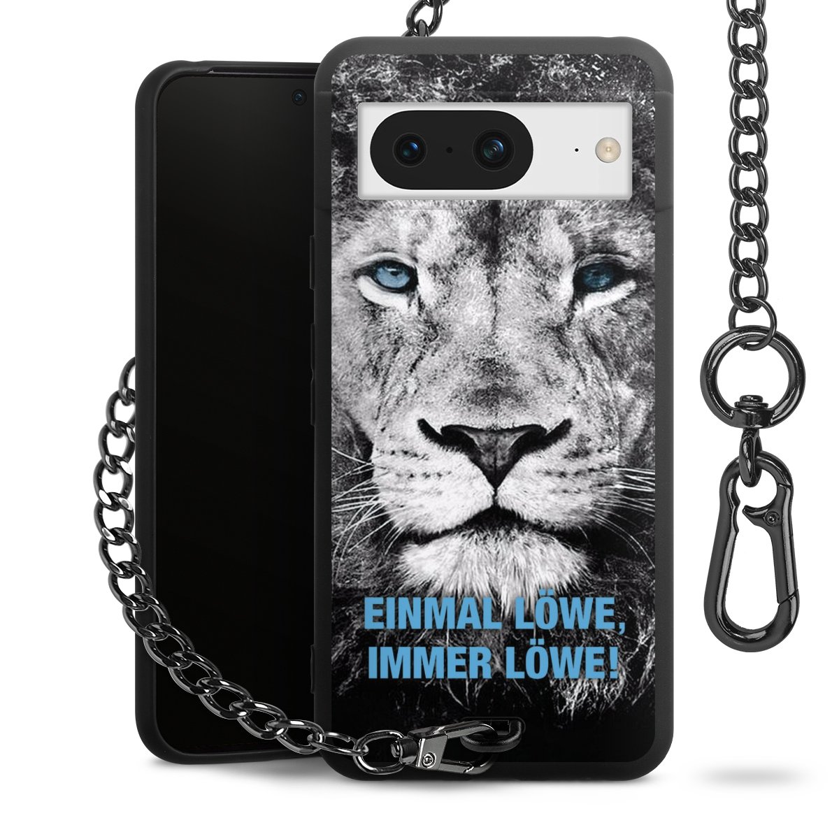 Die Handyhülle verfügt über eine mittig am unteren Rand platzierte Öse, an der die Metallkette stabil befestigt ist. Bestelle die Hülle einfach für Dein Smartphone-Modell, dann passt sie wie angegossen und Du brauchst sie bloß einmal anzudrücken. Handy in die Tasche, Karabiner an den Hosenbund – schon kann die Party starten.
