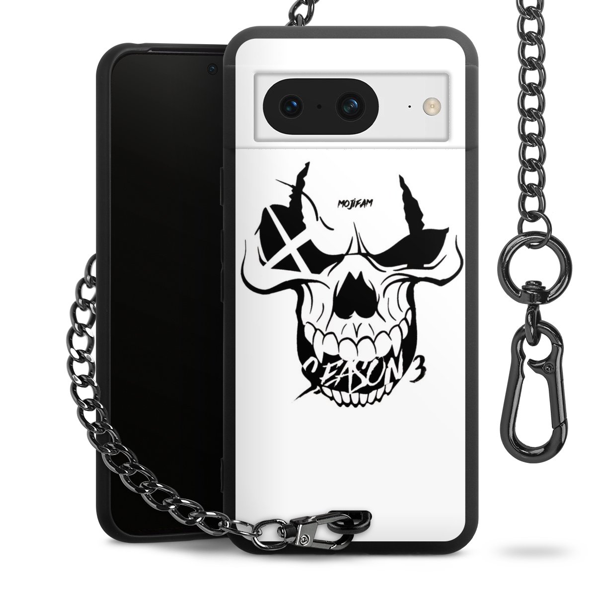 Die mattschwarze Silikon-Handyhülle besteht aus robustem TPU (thermoplastisches Polyurethan). Sie ist flexibel und schützt Dein Smartphone vor Stößen und Kratzern. Die Kette sowie der Karabinerhaken sind aus Metall in Gunmetal-Optik gefertigt. Für dieses Produkt kommen ausschließlich TÜV-geprüfte Materialien zum Einsatz.