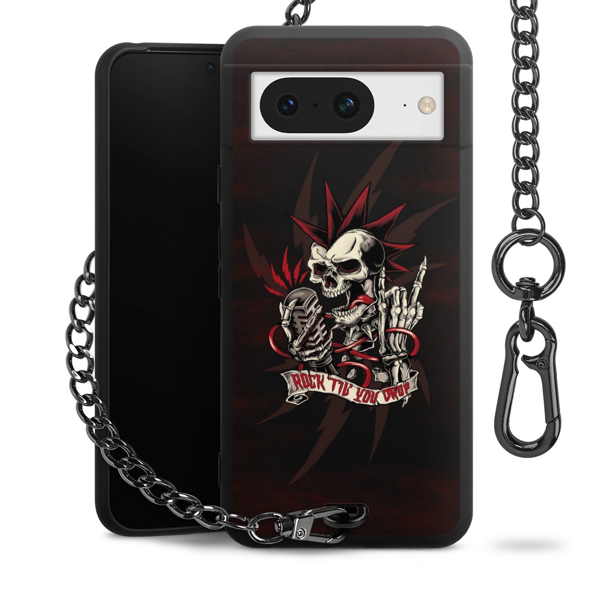 Die mattschwarze Silikon-Handyhülle besteht aus robustem TPU (thermoplastisches Polyurethan). Sie ist flexibel und schützt Dein Smartphone vor Stößen und Kratzern. Die Kette sowie der Karabinerhaken sind aus Metall in Gunmetal-Optik gefertigt. Für dieses Produkt kommen ausschließlich TÜV-geprüfte Materialien zum Einsatz.