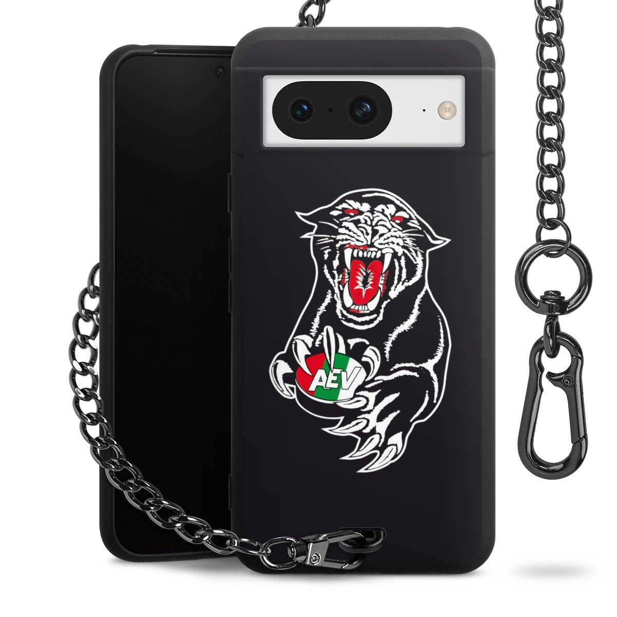 Die mattschwarze Silikon-Handyhülle besteht aus robustem TPU (thermoplastisches Polyurethan). Sie ist flexibel und schützt Dein Smartphone vor Stößen und Kratzern. Die Kette sowie der Karabinerhaken sind aus Metall in Gunmetal-Optik gefertigt. Für dieses Produkt kommen ausschließlich TÜV-geprüfte Materialien zum Einsatz.