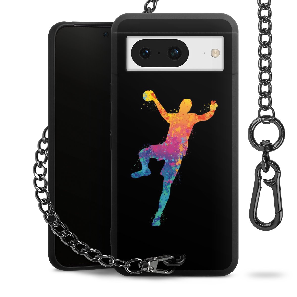 Die mattschwarze Silikon-Handyhülle besteht aus robustem TPU (thermoplastisches Polyurethan). Sie ist flexibel und schützt Dein Smartphone vor Stößen und Kratzern. Die Kette sowie der Karabinerhaken sind aus Metall in Gunmetal-Optik gefertigt. Für dieses Produkt kommen ausschließlich TÜV-geprüfte Materialien zum Einsatz.