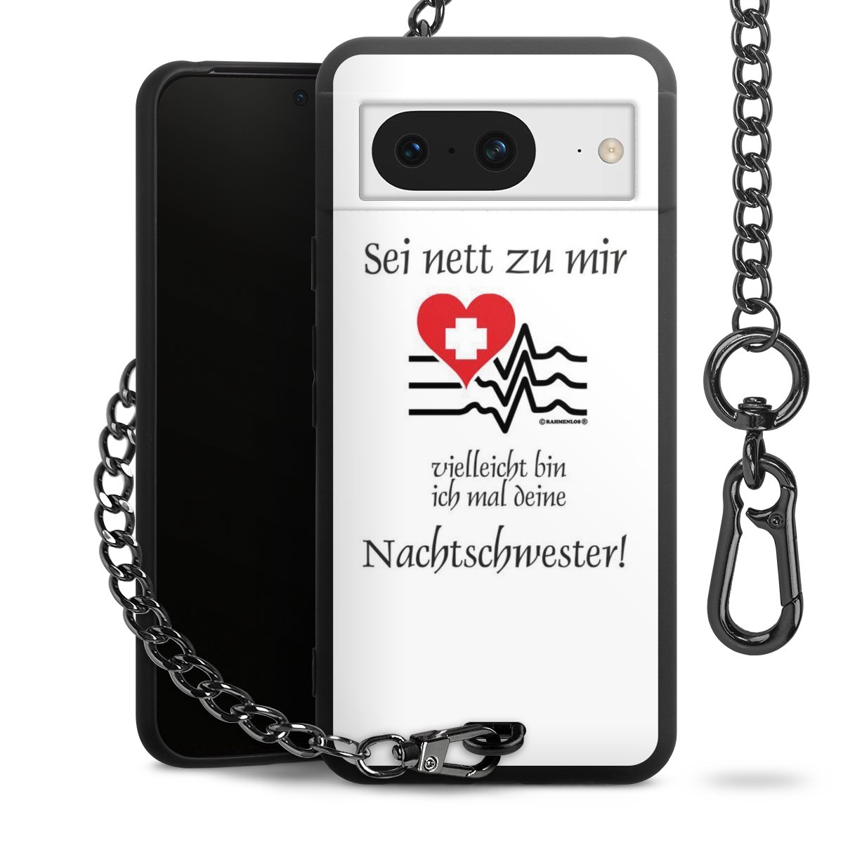 Die mattschwarze Silikon-Handyhülle besteht aus robustem TPU (thermoplastisches Polyurethan). Sie ist flexibel und schützt Dein Smartphone vor Stößen und Kratzern. Die Kette sowie der Karabinerhaken sind aus Metall in Gunmetal-Optik gefertigt. Für dieses Produkt kommen ausschließlich TÜV-geprüfte Materialien zum Einsatz.