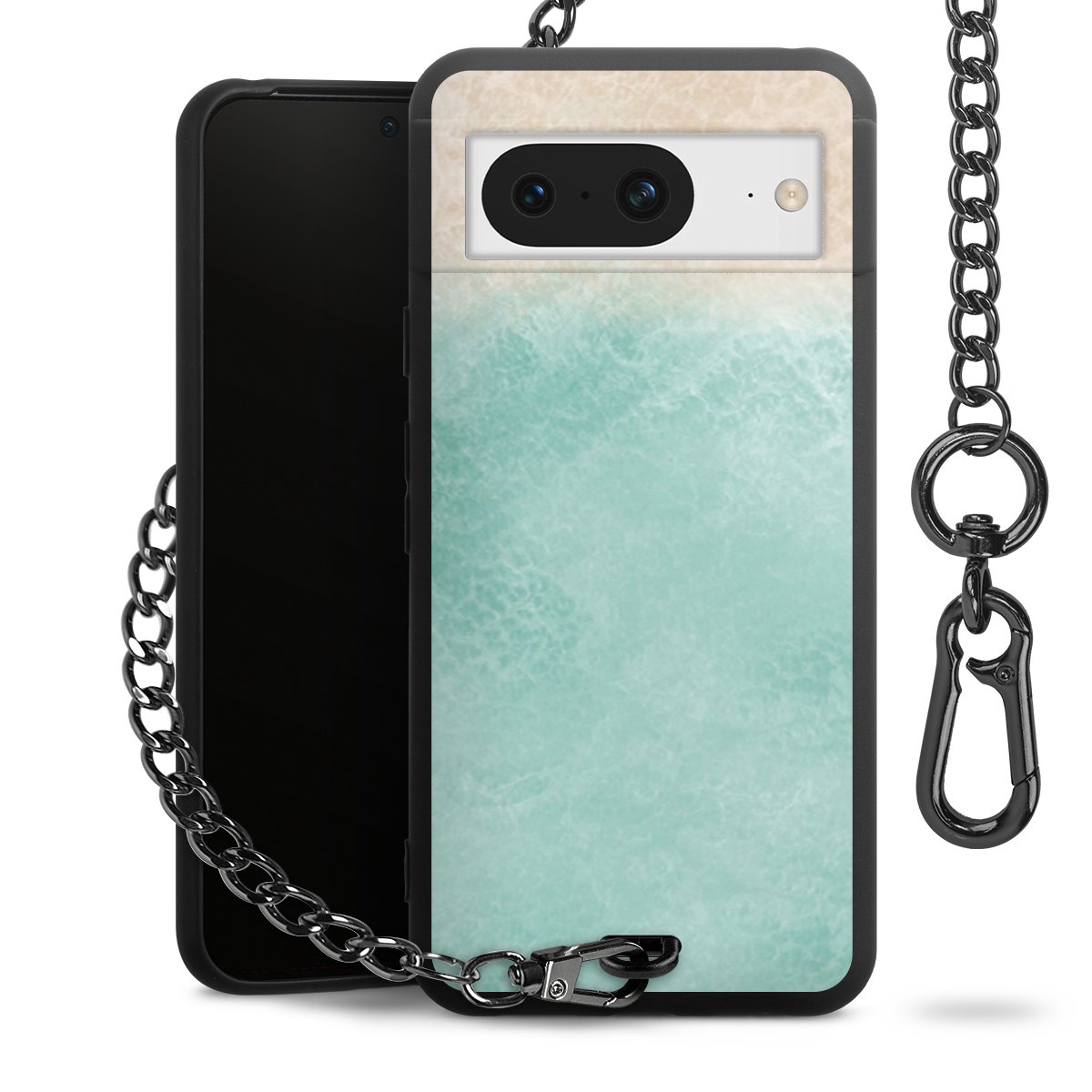 Die mattschwarze Silikon-Handyhülle besteht aus robustem TPU (thermoplastisches Polyurethan). Sie ist flexibel und schützt Dein Smartphone vor Stößen und Kratzern. Die Kette sowie der Karabinerhaken sind aus Metall in Gunmetal-Optik gefertigt. Für dieses Produkt kommen ausschließlich TÜV-geprüfte Materialien zum Einsatz.