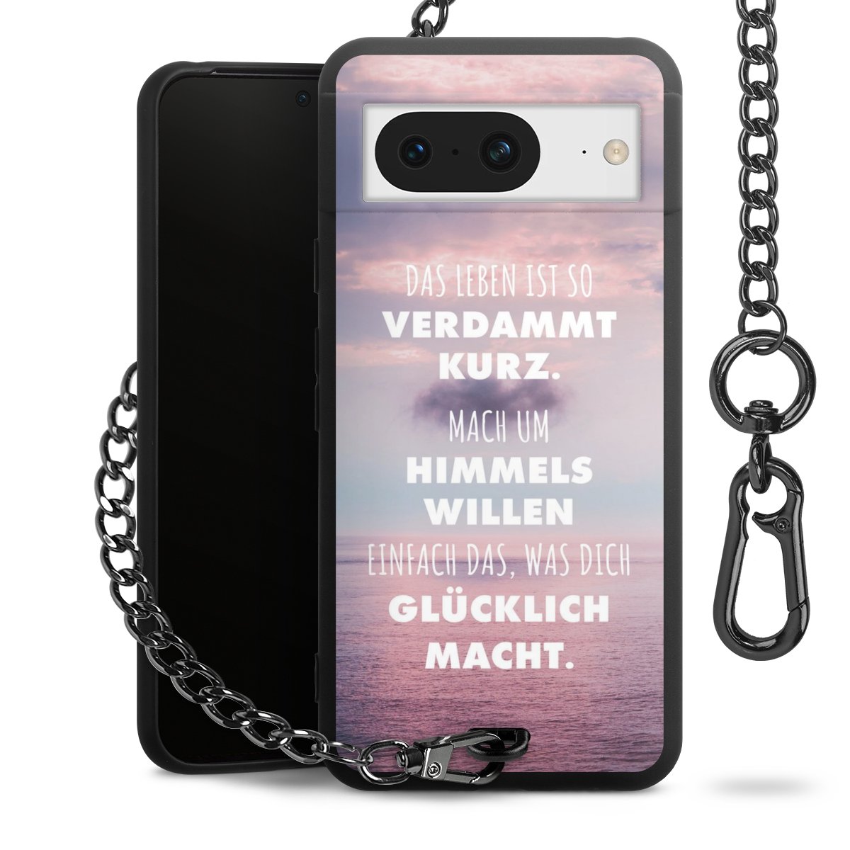 Die mattschwarze Silikon-Handyhülle besteht aus robustem TPU (thermoplastisches Polyurethan). Sie ist flexibel und schützt Dein Smartphone vor Stößen und Kratzern. Die Kette sowie der Karabinerhaken sind aus Metall in Gunmetal-Optik gefertigt. Für dieses Produkt kommen ausschließlich TÜV-geprüfte Materialien zum Einsatz.
