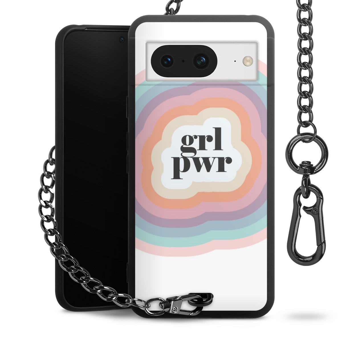 Die mattschwarze Silikon-Handyhülle besteht aus robustem TPU (thermoplastisches Polyurethan). Sie ist flexibel und schützt Dein Smartphone vor Stößen und Kratzern. Die Kette sowie der Karabinerhaken sind aus Metall in Gunmetal-Optik gefertigt. Für dieses Produkt kommen ausschließlich TÜV-geprüfte Materialien zum Einsatz.